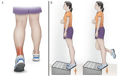 1) Heel-raise: Stand with your feet a few inches apart. Raise up on to your tiptoes and lift the heels by using both legs. Then lower yourself down using the affected leg. Perform 3 sets of 15 repetitions twice per day. This exercise can also be performed seated in a chair.