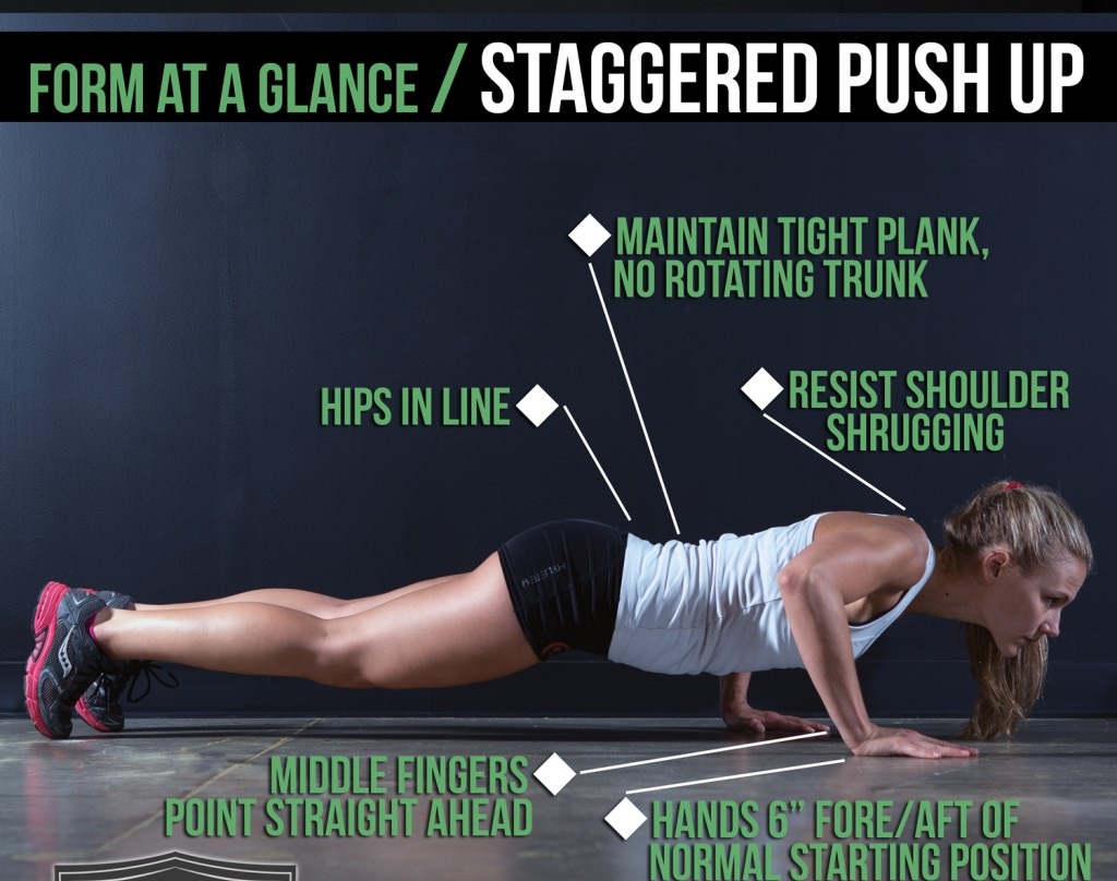 a. Assume a prone position with your body straight, supported by your extended arms and your toes. Your hands should be outside of shoulder width but staggered, with one being higher than the other. This will be your starting position.