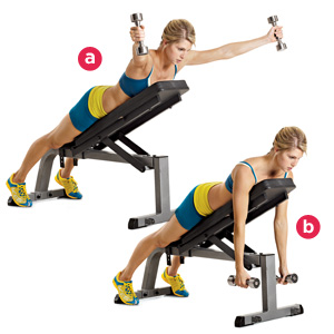 3. Lift the dumbbells up, keeping your arms straight, to make a “Y” shape with your torso.