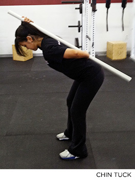 2. Hip Hinge: an excellent precursor to the deadlift. Knowing the technical aspects of the hip hinge can help you in so many ways. Start standing in a neutral position, focusing on good posture. You can hold a broom stick or dowel along your spine as an external cue. Make sure the stick is always connected to the back of your head, your upper back and your sacrum (the lowest part of your spine that sits between your hip bones or pelvis). Create tension by activating your abdominal muscles. As you bend forward, stick your butt out and lower your chest, thinking about keeping that neutral spinal alignment. As you return to standing, dig your heels into the ground and squeeze your buttocks to thrust hips forward.