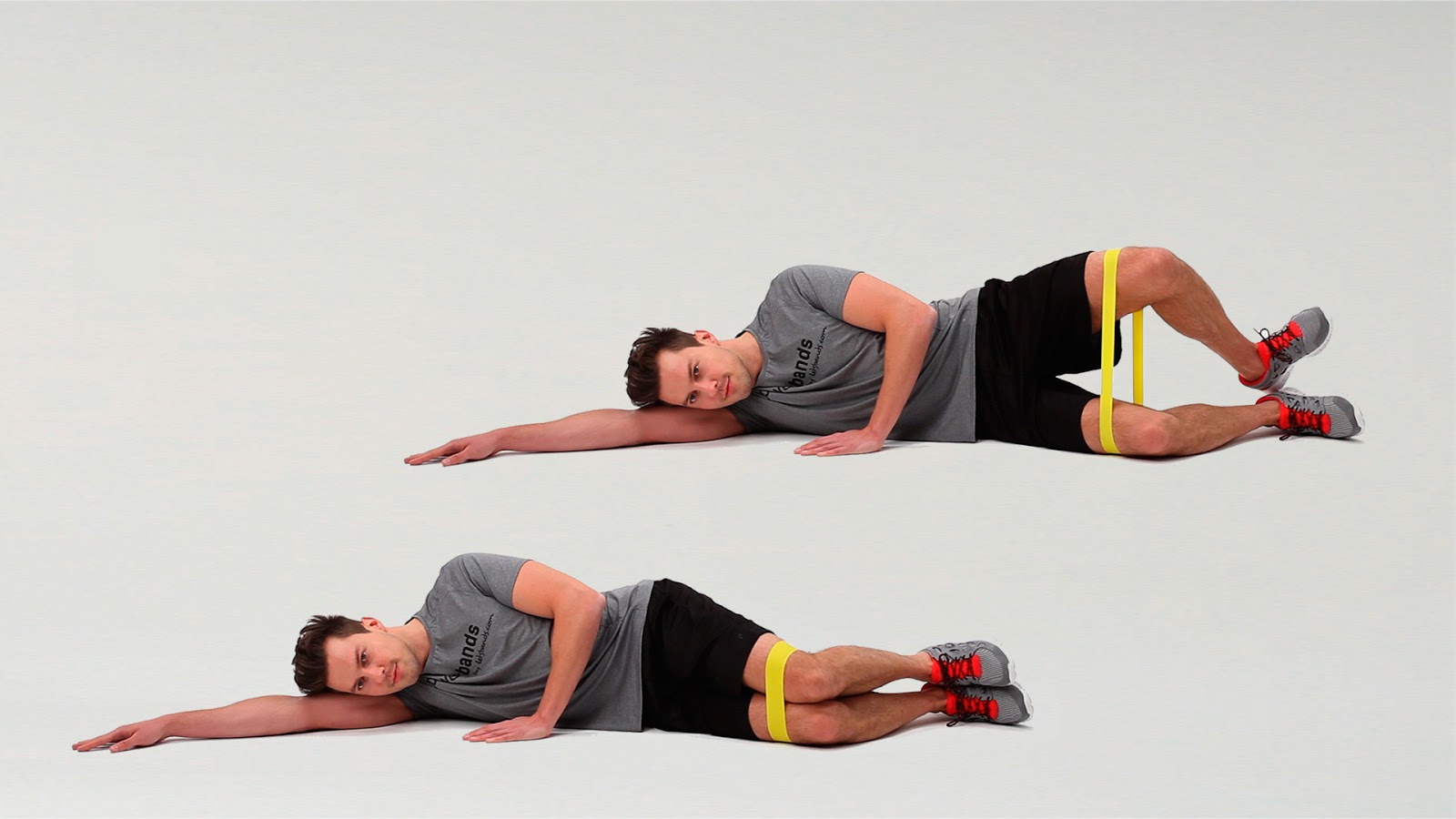 Lie on your side with your hips at 45° and your knees at 90° with a band above your knees. Keep your feet together at all times as you open your top knee up against the resistance of the band. Slowly bring the top knee back to meet the bottom knee. Repeat for 10 repetitions. Then complete on the other side.