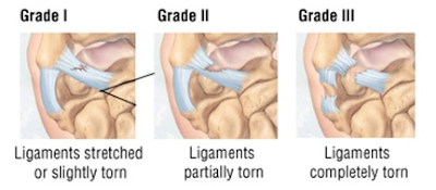 1) Grade I – Mild Sprain: minor tearing of some ligament, no loss of function