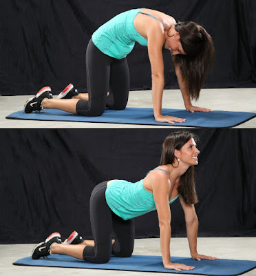 Start on all fours on mat with knees hips-width apart and hands directly beneath shoulders. Exhale and round back toward ceiling like a cat, head drooping down. Pull navel in toward spine. Hold momentarily. Inhale and drop belly down toward floor, lifting head high. Allow ribcage to expand and chest to stretch. Hold. Perform 15 cycles.