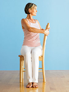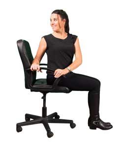 3. Spine twist stretch (do not do this stretch if your are dealing with any disc issues): Use the arms of your chair or the back of your chair, depending on what you have or what feels comfortable.