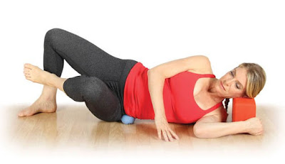 - Lie on the ground and place one ball on the side of your hip, then lean into the ball. Make slow circles with the hip and leg as it rests on the ball. Circle 12 times in each direction.
