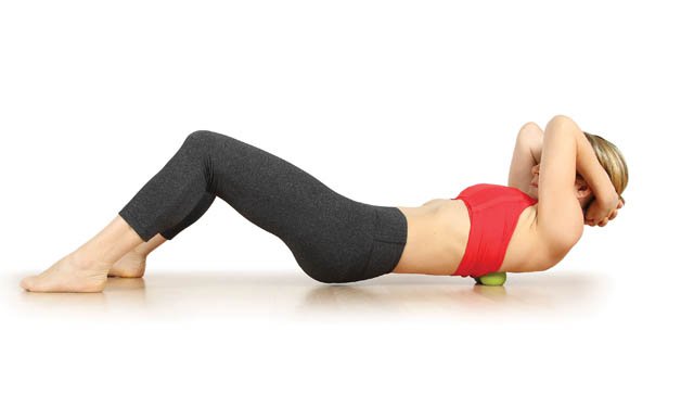 - Lie down and place two balls side by side on either side of your upper back. (You can place them in a tote, stocking, or sock, if you’d like.) Interlace your hands behind your head and lift your head off the floor, bringing your chin toward your chest. Lift your bottom off the floor and take 3 deep breaths into your ribs.